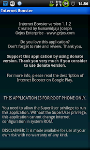 Internet Booster needs root permissions. You need to allow the SuperUser privileges to run this application. Without the SuperUser privileges, this application cannot change internet configuration in system ROM. Internet Booster (root) is not a placebo, nor a prank, nor a fake application.